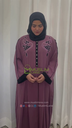This is a simple and beautiful Abaya, the main cause of its unique multicolor look is sharpness and stability. This article has piping work on sleeves and buttons placed on the top middle and embroidery on the chest. This piece crafted by Crepe fabric. This can be used as casual and formal wear. A complementary Hijab that comes with this Islamic dress makes it more affordable.