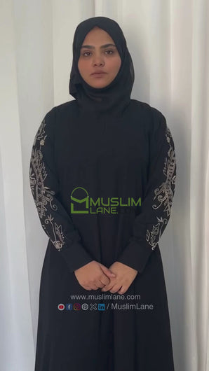 Full Sleeves Beige Embroidery Abaya in Black Color With Hijab (003)