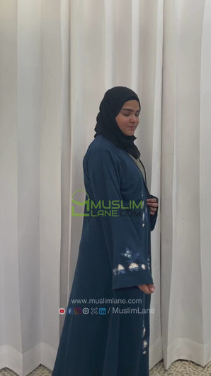 This is a designer abaya with an attached upper layer. Unique embroidery work on the front panel, chest, and sleeves gives stunning looks. This is made of Crepe fabric. It comes with a complementary Hijab.